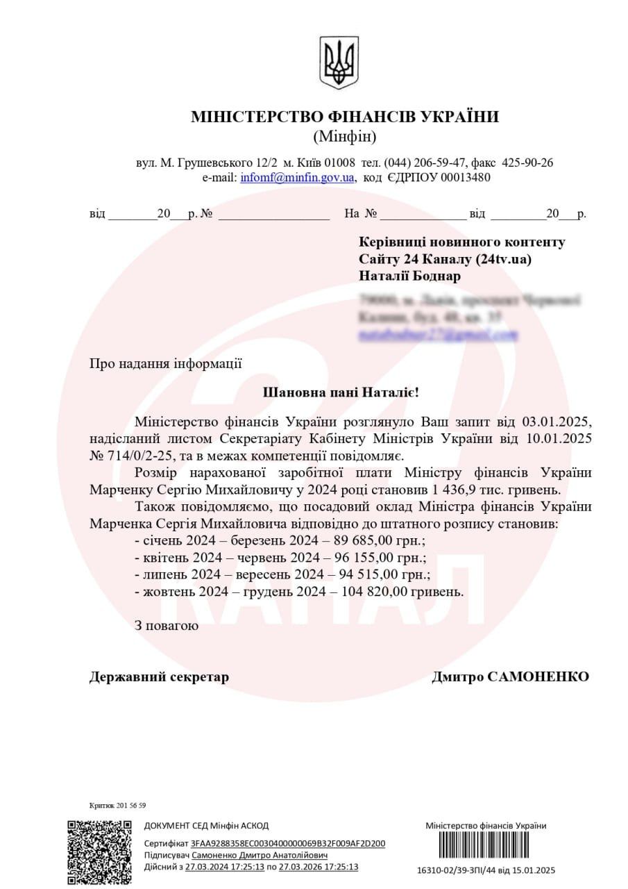 В ответ на запрос 24 Канала Минфин указал, что в общем за 2024 год министр финансов Украины получил заработную плату в размере 1 436,9 тысячи гривен.
