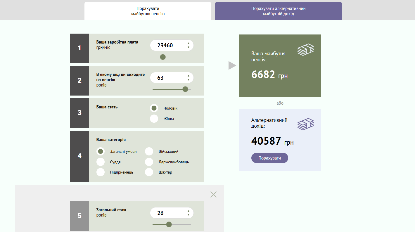 Какая пенсия со стажем 26 лет и зарплатой 23 460 гривен в 63 года / Скриншот с пенсионного калькулятора