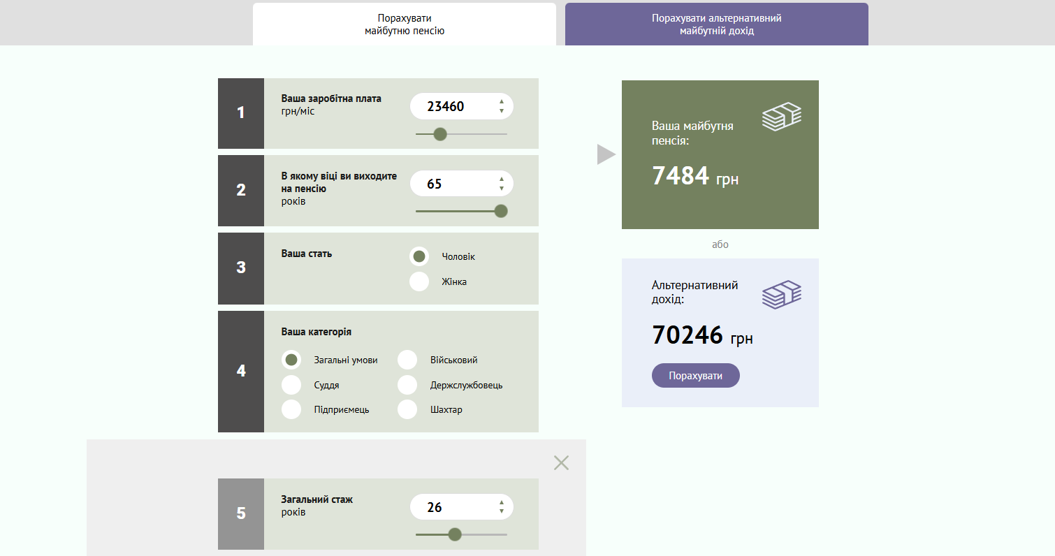 Какая пенсия со стажем 26 лет и зарплатой 23 460 гривен в 65 лет / Скриншот из пенсионного калькулятора