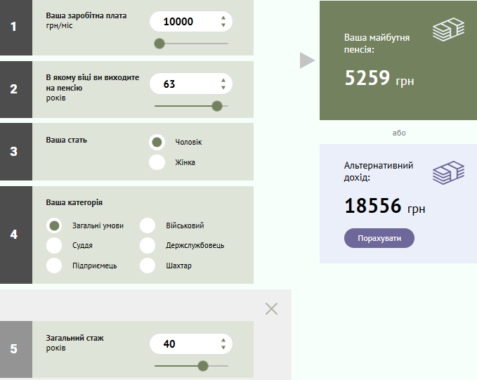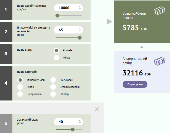 Какая будет пенсионная выплата при зарплате 10 тысяч гривен и стаже 40 лет в 2025 / Скриншот Пенсионный калькулятор