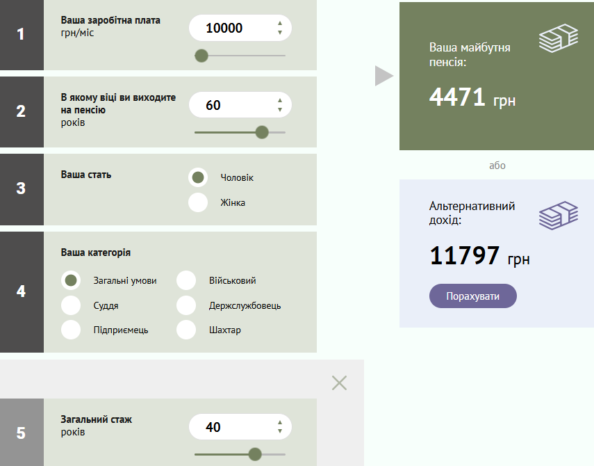 Как влияет возраст на пенсию в 2025 / Скриншот пенсионный калькулятор