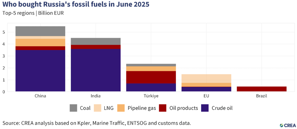 Цифры подтверждают картину. По данным Центра исследований энергетики и чистого воздуха (CREA), в 2024–2025 годах Китай покупал около 47% российской сырой нефти, Индия – 38%. В денежном измерении Китай в 2024 году заплатил за российские энергоносители более 80 миллиардов долларов, а Индия – около 60 миллиардов долларов, став главными финансовыми донорами военной экономики Кремля.