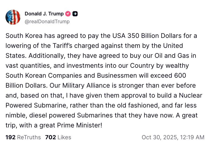 Южная Корея согласилась выплатить США 350 миллиардов долларов за снижение тарифов, сообщает 24 Канал со ссылкой на сообщение Трампа в Truth Social.