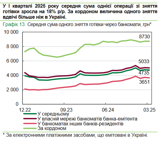 За пределами страны эта сумма почти вдвое выше – 8 730 гривен за одно снятие, передает 24 Канал со ссылкой на Обзор банковского сектора НБУ за I квартал 2025 года.