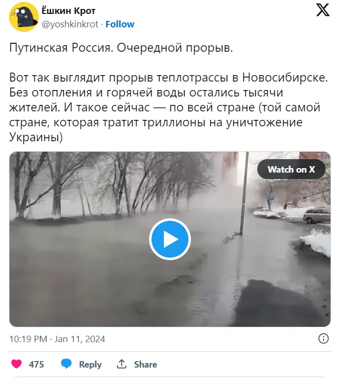Так, например, об отсутствии отопления в соцсети Х (Twitter) рассказывают жители Новосибирска. Из-за прорыва теплотрассы без отопления и горячей воды остались тысячи жителей.