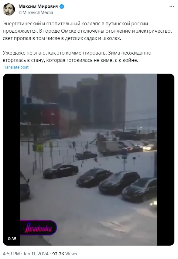 Кроме отсутствия электроэнергии, в российских городах массово отсутствует отопление, в некоторых домах температура не превышает 6 градусов.