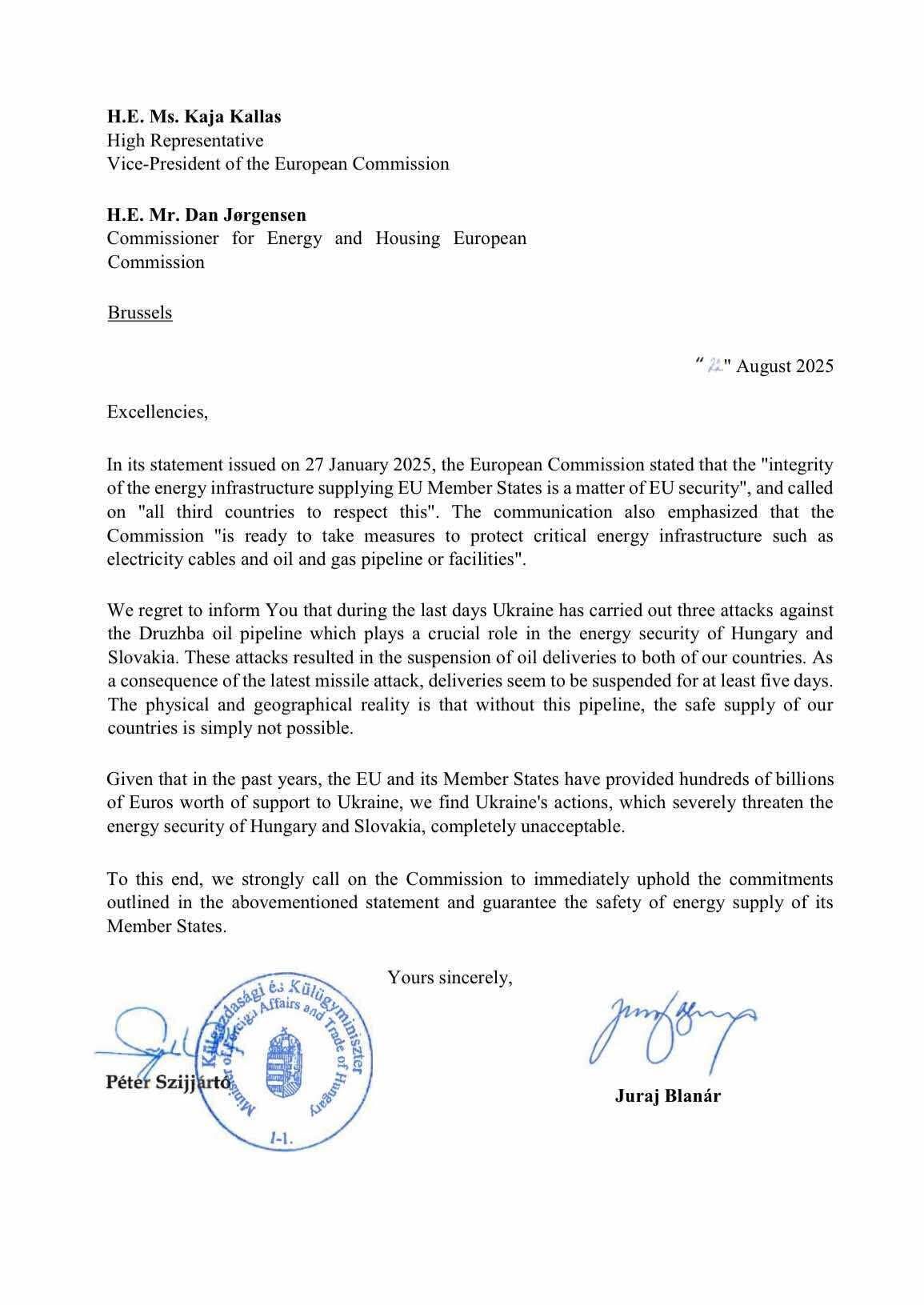 Учитывая, что в последние годы ЕС и его страны-члены оказали Украине поддержку на сотни миллиардов евро, мы считаем действия Украины, которые серьезно ставят под угрозу энергетическую безопасность Венгрии и Словакии, абсолютно неприемлемыми,