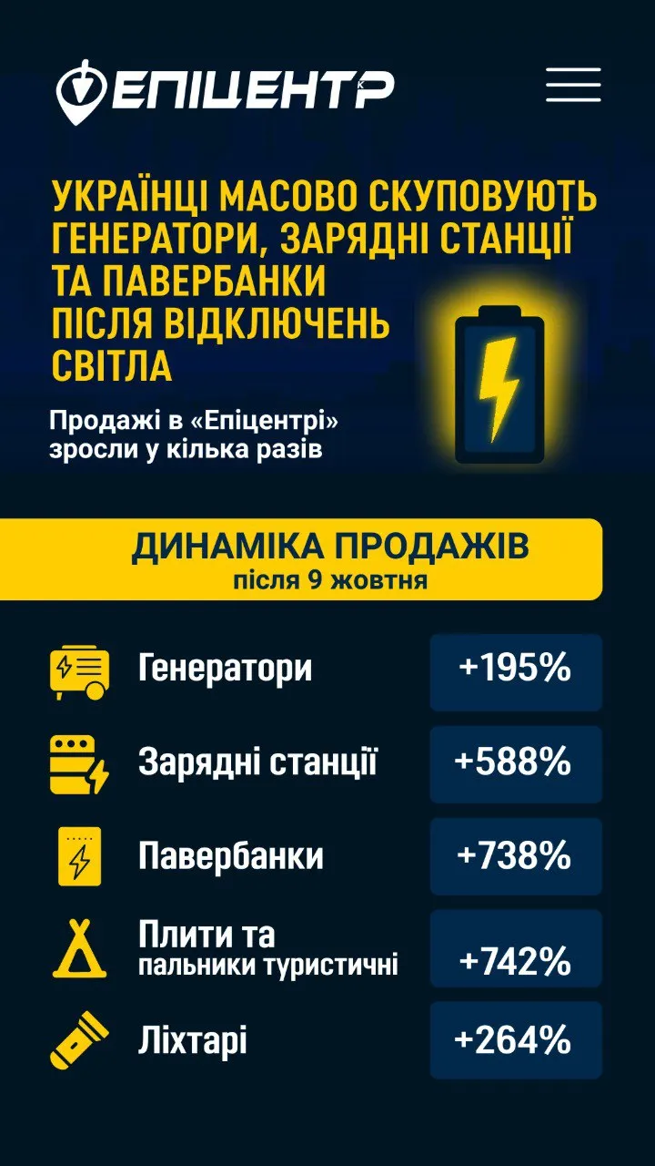 Однако в первые часы масштабного блэкаута в Киеве через онлайн-заказ было выкуплено большинство остатков со складов. Поставщики товаров сразу корректировали стоимость отдельных категорий, произошел средний рост цен на 20%. Также некоторые поставщики приостановили акции и распродажи, чтобы избежать дефицита.