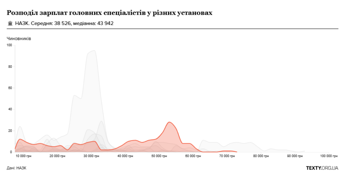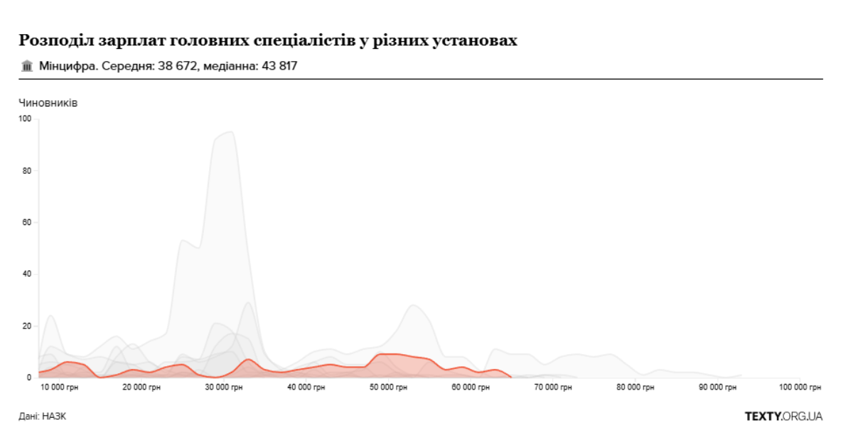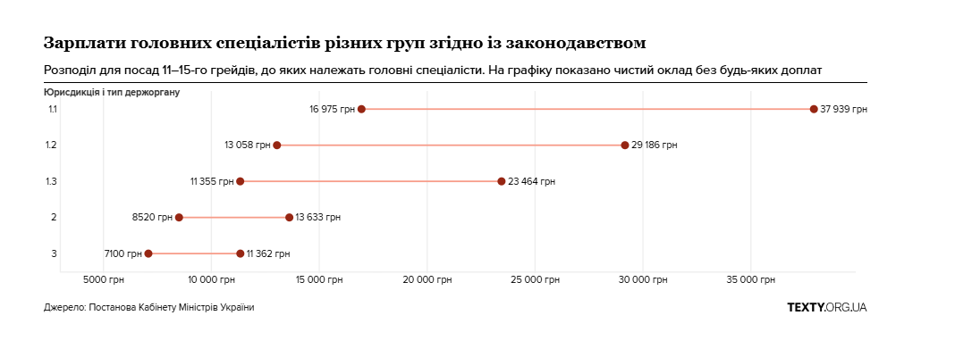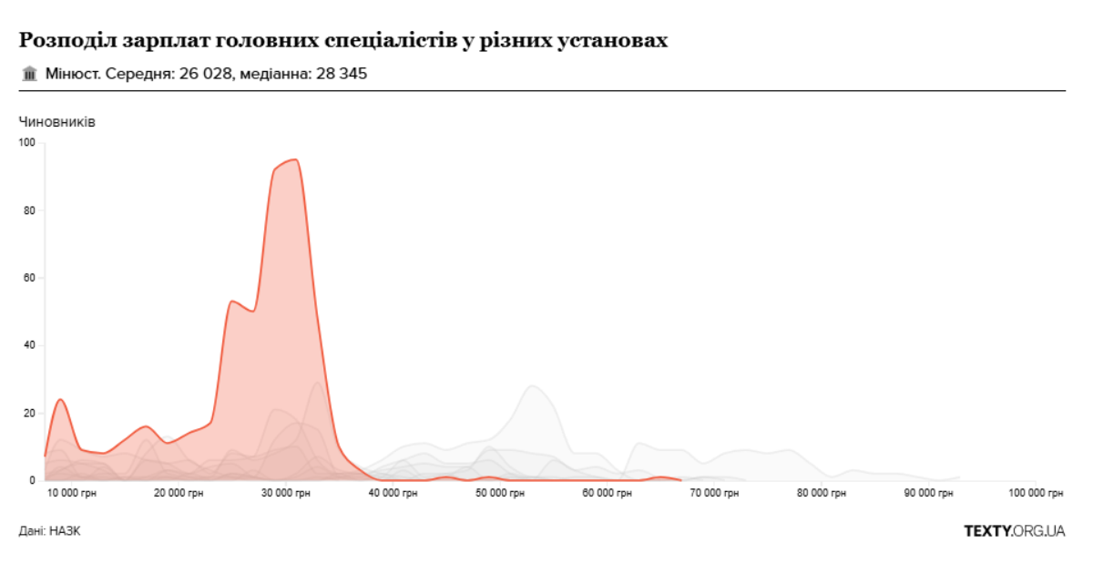 Существенную разницу можно даже наблюдать в пределах одного ведомства. В частности, в Министерстве юстиции некоторые главные специалисты получают до 30 тысяч гривен, а некоторые – 65 тысяч гривен.