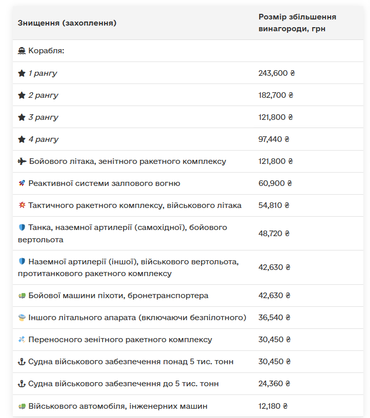 Например, доплата за уничтожение корабля составляет 243 600 гривен, а за ликвидацию боевого самолета – 121 800 гривен.