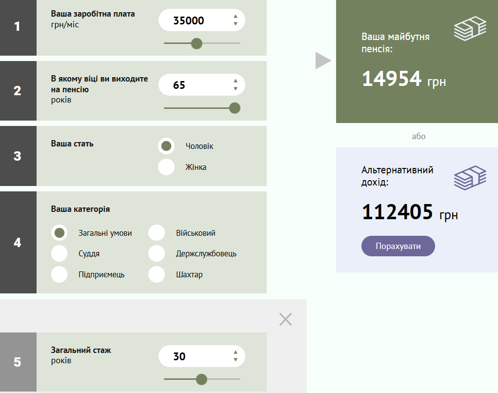 Яка буде пенсія при 30 роках стажу і зарплаті більш як 30 тисяч / Скриншот пенсійного калькулятора