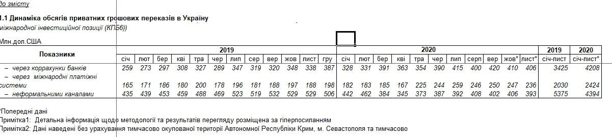 У листопаді в Україну переказали 1 035 мільйонів гривень. Для порівняння: за аналогічний період 2019 року було на 20 мільйонів доларів більше – 1 055 мільйонів.