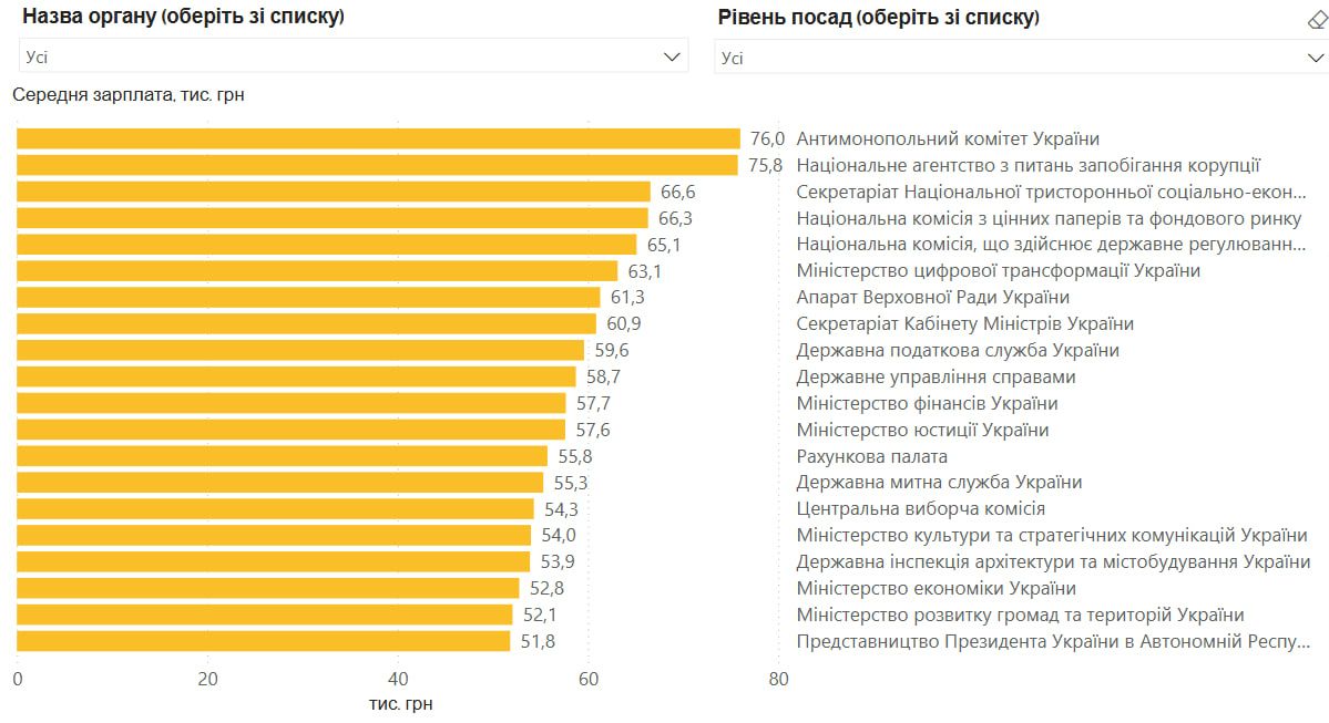 Середній рівень зарплат в державних органах змінюється від десятків тисяч гривень до сотень тисяч. Якщо брати за усіма посадами, то найбільше отримують працівники Антимонопольного комітету. Водночас якщо брати лише керівництво відомств, то лідером за рейтингом середньої зарплати є Державна служба фінансового моніторингу.