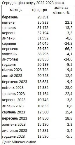 Вартість у грудні склала 13 596 гривень за 1 тисячу кубометрів без урахування ПДВ, що на 5,5% менше, ніж у попередньому місяці. Отже, це вже був другий місяць поспіль, коли ціни на газ знижувались.