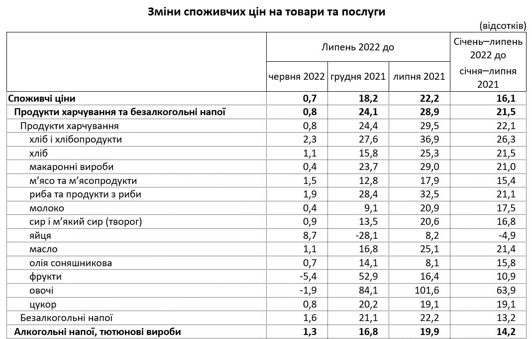 За даними Державної служби статистики, на споживчому ринку в липні ціни на харчі та безалкогольні напої зросли на 0,8%. Найбільше (на 8,7%) подорожчали яйця. На 5,1 – 1,1% зросли ціни на продукти переробки зернових, рис, свинину, сало, рибу та продукти з риби, безалкогольні напої, хліб, масло. Водночас на 5,4 – 1,9% подешевшали фрукти, яловичина та овочі.