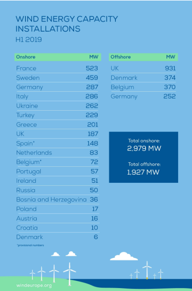 За першу половину 2019 року Україна встановила вітряні електростанції загальною потужністю 262 мегавати. Це п'ятий показник серед європейських країн.