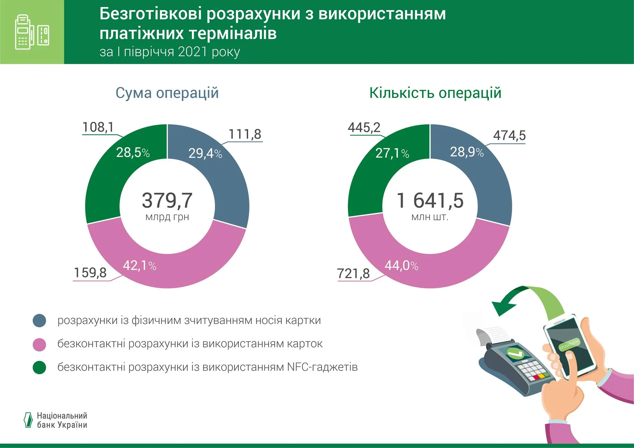 Загалом у січні – червні 2021 року проти першого півріччя 2020 року кількість безготівкових операцій із використанням карток збільшилася на 36%, а їхня сума – на 42%,