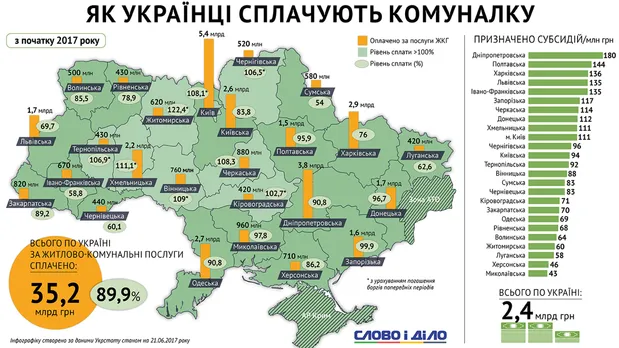 Як свідчить інфографіка, найкраще виплачують комуналку жителі Житомирської області – тут з початку року повністю виплатили усі рахунки та 22% погасили заборгованість за минулий рік.