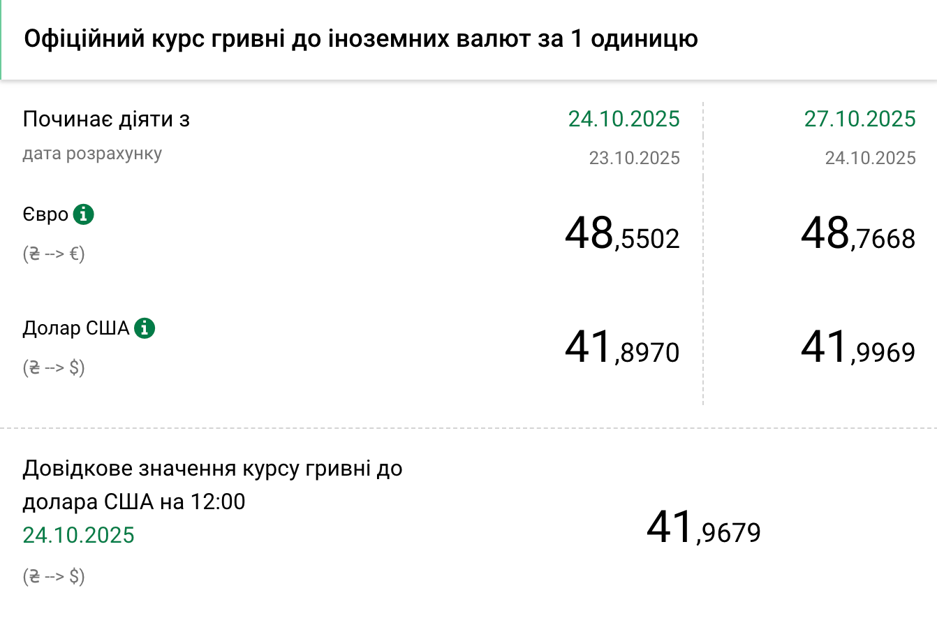 Офіційний курс станом на 27 жовтня 2025 року встановлено на рівні: 41,9969 гривні за 1 долар (+0,0999 гривень), пише 24 Канал з посиланням на Національний банк України.
