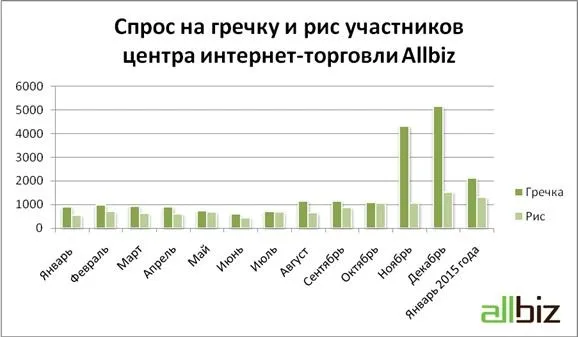 Статистика про кількість замовлень, що надійшли через систему Allbiz, також демонструє різкий сплеск попиту на крупи в грудні. На гречку – в 2,5 рази в грудні в порівнянні з листопадом. На рис – в 2 рази. При цьому в січні порівняно з жовтнем кількість запитів зменшилася всього на 2-3%.