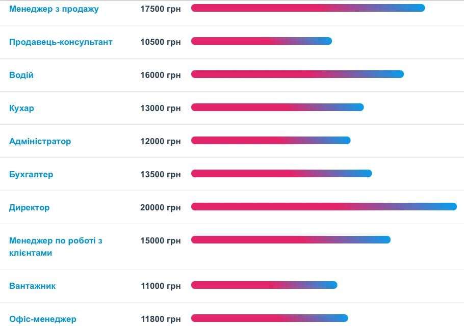За кількістю вакансій, які розміщують на платформі Work.ua, лідирують менеджери з продажу з середньою зарплатою у 17,4 тисячі гривень. Далі у рейтингу йдуть продавці-консультанти, водії, кухарі, адміністратори та бухгалтери.