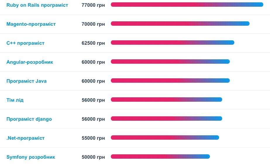 - IT-фахівці та програмісти – найбільш затребувана вакансія в Україні з зарплатнею, в середньому, у межах 70 тисяч гривень.