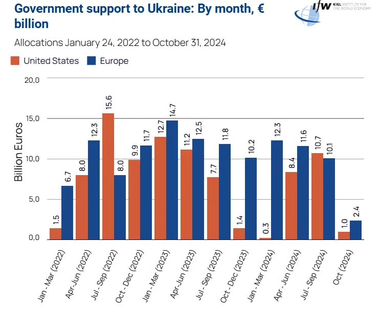 Відповідно до інфографік Кільського університету єдиним періодом впродовж повномасштабного вторгнення, коли США надали Україні більше допомоги, аніж Європа, став липень – вересень 2022 року.