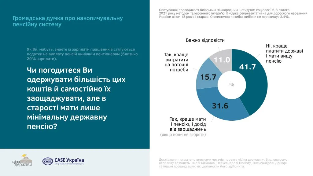 - 37,7% – згодні на нинішню пенсійну систему, коли держава гарантує невелику, але довічну пенсію
