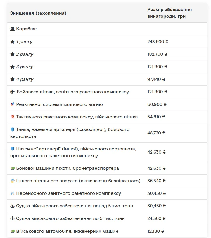 Наприклад, доплата за знищення корабля становить 243 600 гривень, а за ліквідацію бойового літака – 121 800 гривень.