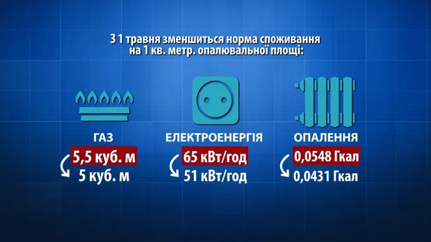 Від сьогодні економити доведеться ще більше. Норми споживання комунальних послуг зменшилися. З 1 травня на оселю "пільгового" газу виділятимуть 5 метрів кубічних, а не 5,5, як було досі, а електроенергії – 51 кіловат.
