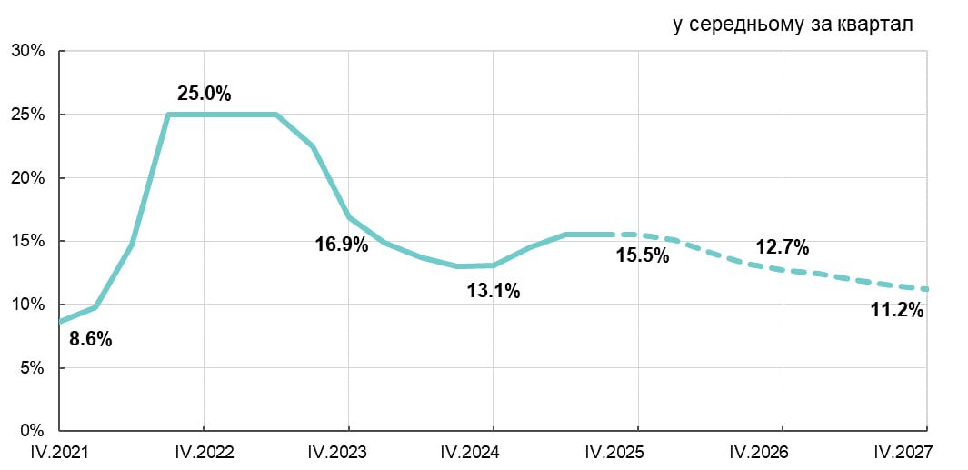 Нагадаємо, за прогнозом Нацбанку річна інфляція може сповільнитися до 6,6%, тоді як у 2027 році – до 5%.