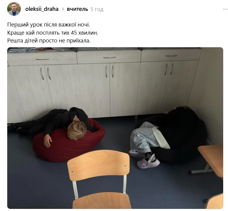 Діти надолужують сон після нічної атаки. Вчитель не заважає,