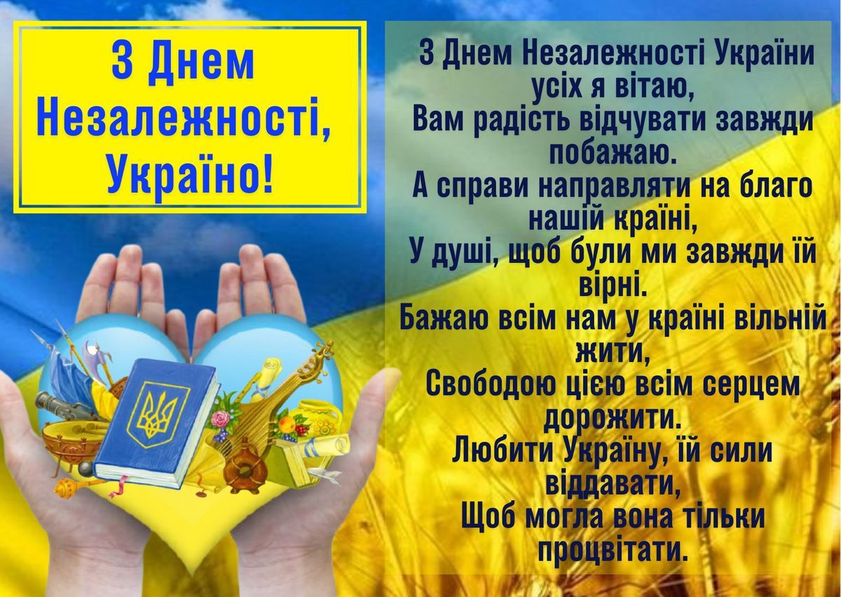 Цей день – як обійми предків, як голос землі, що кличе нас бути собою. Вітаю з Днем Незалежності! Нехай твоя душа завжди знаходить силу в українському слові, у пісні, у пам’яті.