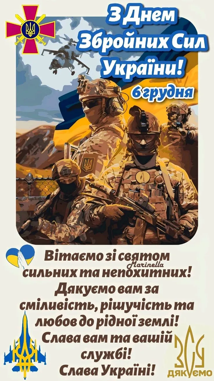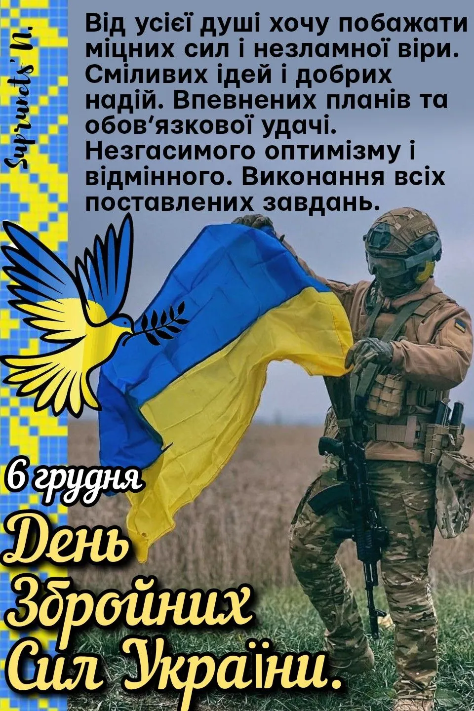 День Збройних Сил України – це день гордості й вдячності. Ми дякуємо вам, воїни, за те, що ви тримаєте небо мирним, землю – вільною, а серця українців – сповненими віри. Ви – справжні герої, які показують світові, що Україна незламна. Нехай ваша сила множиться, а вдячність народу буде вашим найвищим орденом.