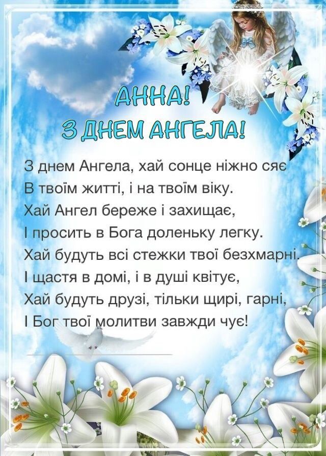 Анно, хай твій день буде наповнений сонячними усмішками й теплими словами. Нехай Господь благословить тебе щедрою долею, а ангел-охоронець завжди буде поруч. Бажаю тобі миру, радості й натхнення у всіх починаннях.