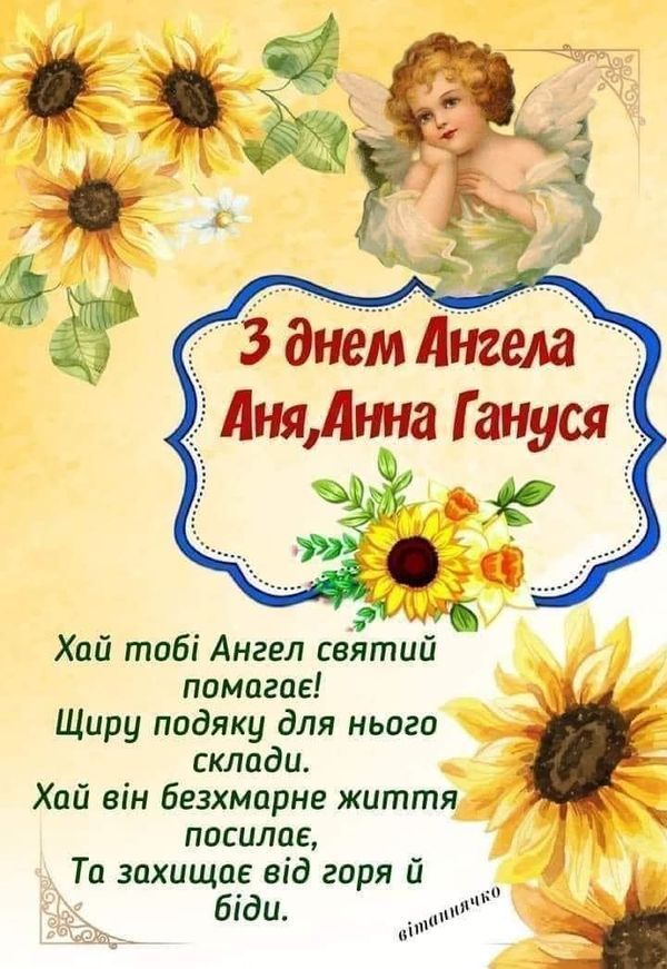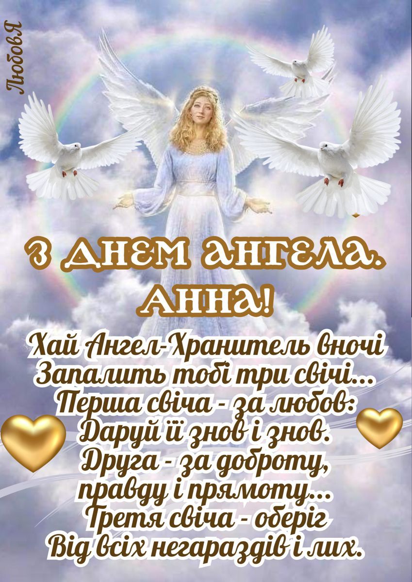 Нехай приклад святої Анни надихає тебе на добрі справи, дарує силу та мудрість у всіх життєвих рішеннях. Бажаю, щоб твоя душа завжди сяяла світлом доброти, а поруч були люди, які цінують і підтримують тебе. Хай твій ангел-охоронець береже тебе від негараздів і веде шляхом щастя.