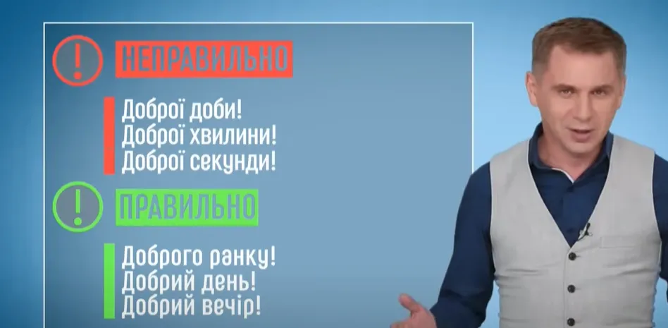 Авраменко зазначив: вітаючись вранці, треба використовувати родовий відмінок (чого?) – "Доброго ранку!". А вдень і ввечері – називний (що?) – "Добрий день!", "Добрий вечір!" – а не "Доброго дня!".