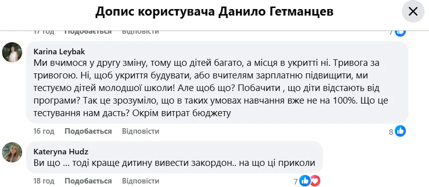 - Ми вчимося у другу зміну, тому що дітей багато, а місця в укритті ні. Тривога за тривогою. Ні, щоб укриття будувати, або вчителям зарплатню підвищити, ми тестуємо дітей молодшої школи! Але щоб що? Побачити, що діти відстають від програми?
