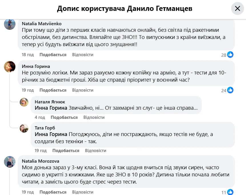 - Моя донька зараз у 3 класі. Вона й так щодня вчиться під звуки сирен, часто сидимо в укритті з книжками. Яке ще ЗНО в 10 років? Дитина тільки почала любити читати, а замість цього буде стрес через тести.