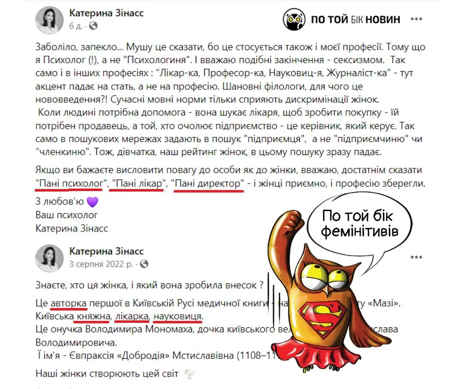 Катерина Зінасс у своєму дописі на фейсбуці наголосила: "Я Психолог (!), а не "Психологиня". І вважаю подібні закінчення – сексизмом. Так само і в інших професіях: "Лікар-ка, Професор-ка, Науковиц-я, Журналіст-ка"…
