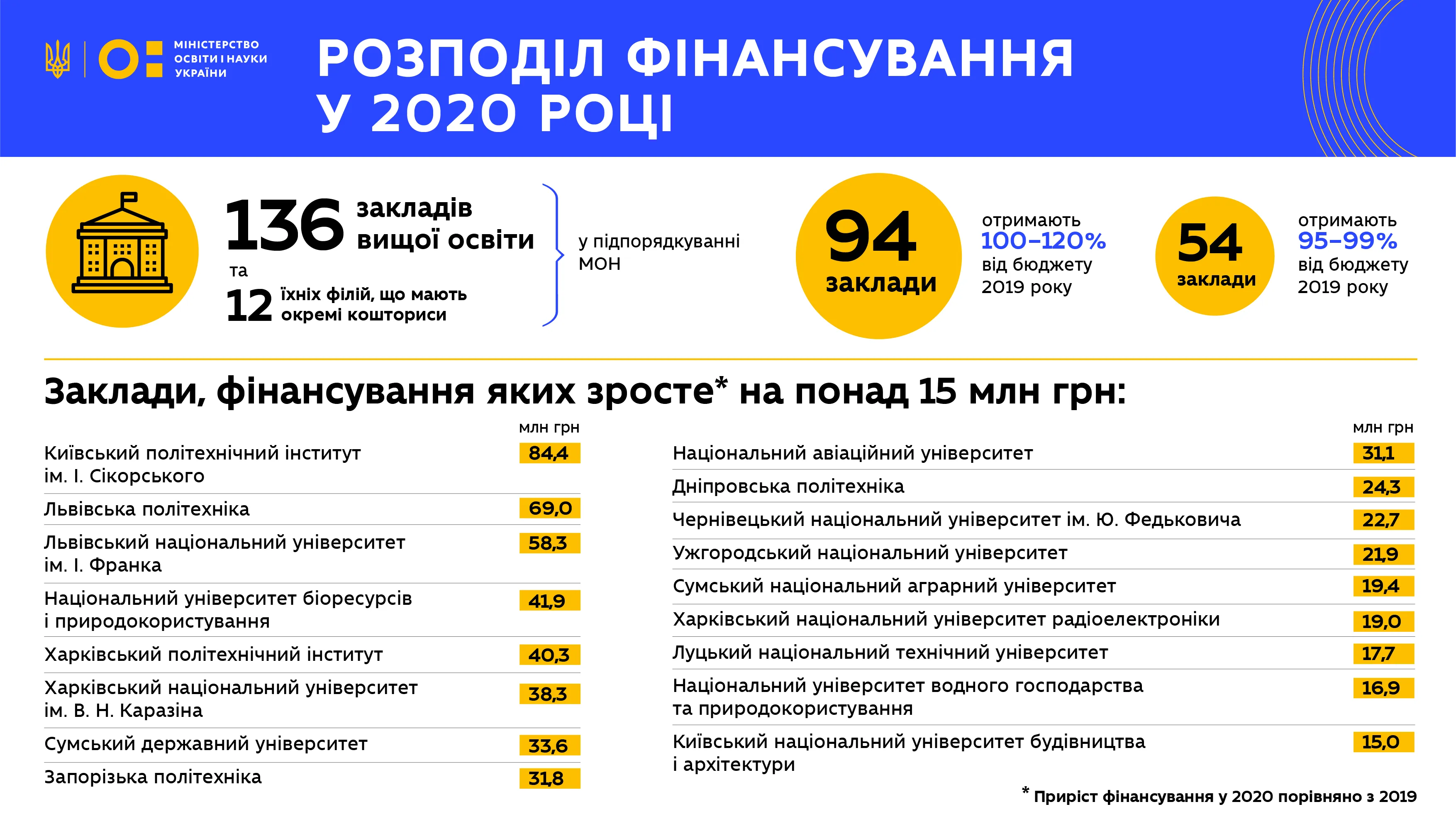 На сайті Міносвіти України написали, що фінансування за формулою отримають 136 закладів вищої освіти та 12 їхніх філій, які мають власні кошториси. У 2020 році 94 заклади отримають 100-120% від бюджету 2019 року. Завдяки новій формулі розрахунку фінансування, за формулою у 2020 році, 17 університетів отримали збільшення фінансування на понад 15 мільйонів гривень.