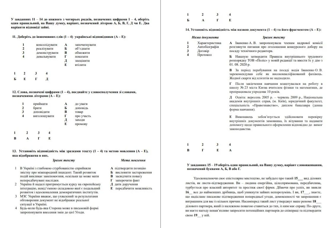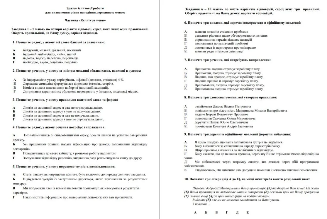 Іспит складається з двох блоків – письмового й усного. Так, завдання письмового блоку передбачають виконання таких частин роботи: “Культура мови”, “Читання” та “Письмо”.