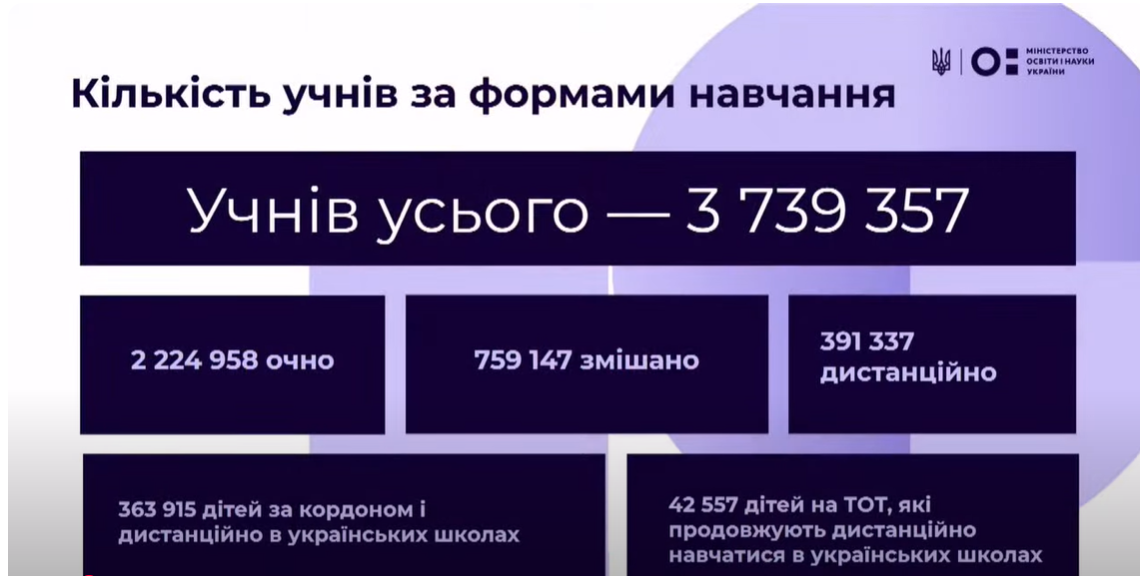 З вищезгаданої цифри 2 224 958 учнів навчаються очно, 759 147 – за змішаною формою, 391 337 дітей – дистанційно.