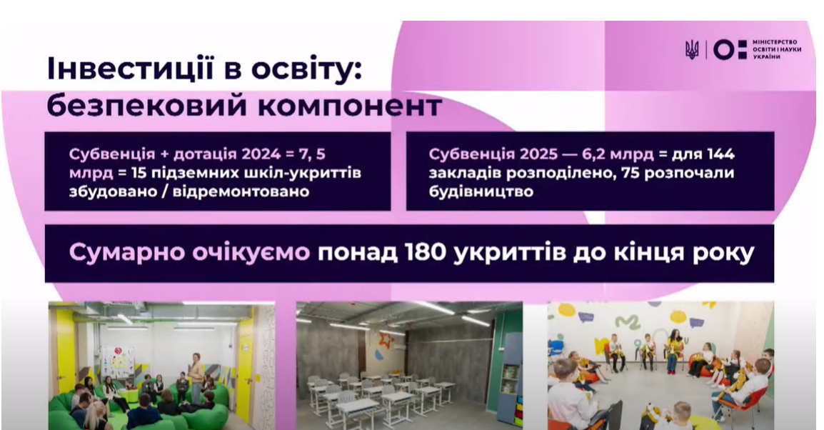 Кузьмичова також нагадала, що цьогоріч додатково до субвенції 2024 року на підземні школи виділили 6,2 мільярда гривень. За ці кошти мають спорудити підземні школи, зокрема, у 144 закладах освіти. У 75 роботи вже стартували.