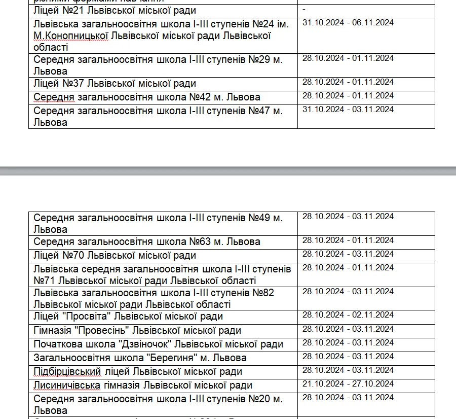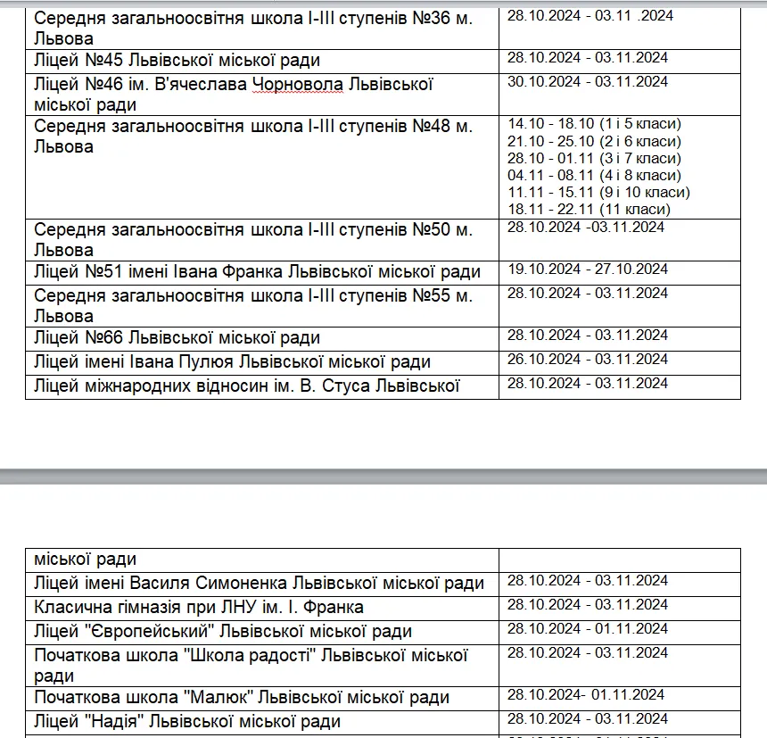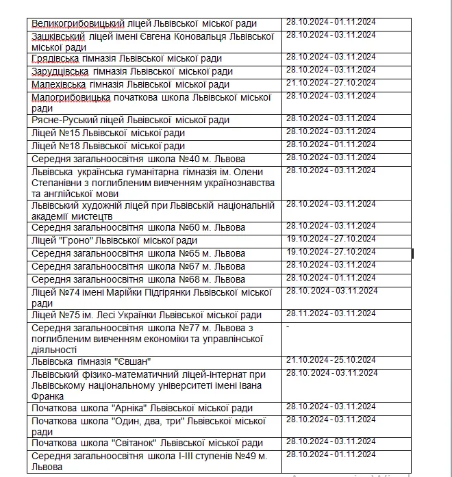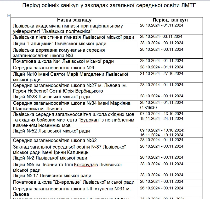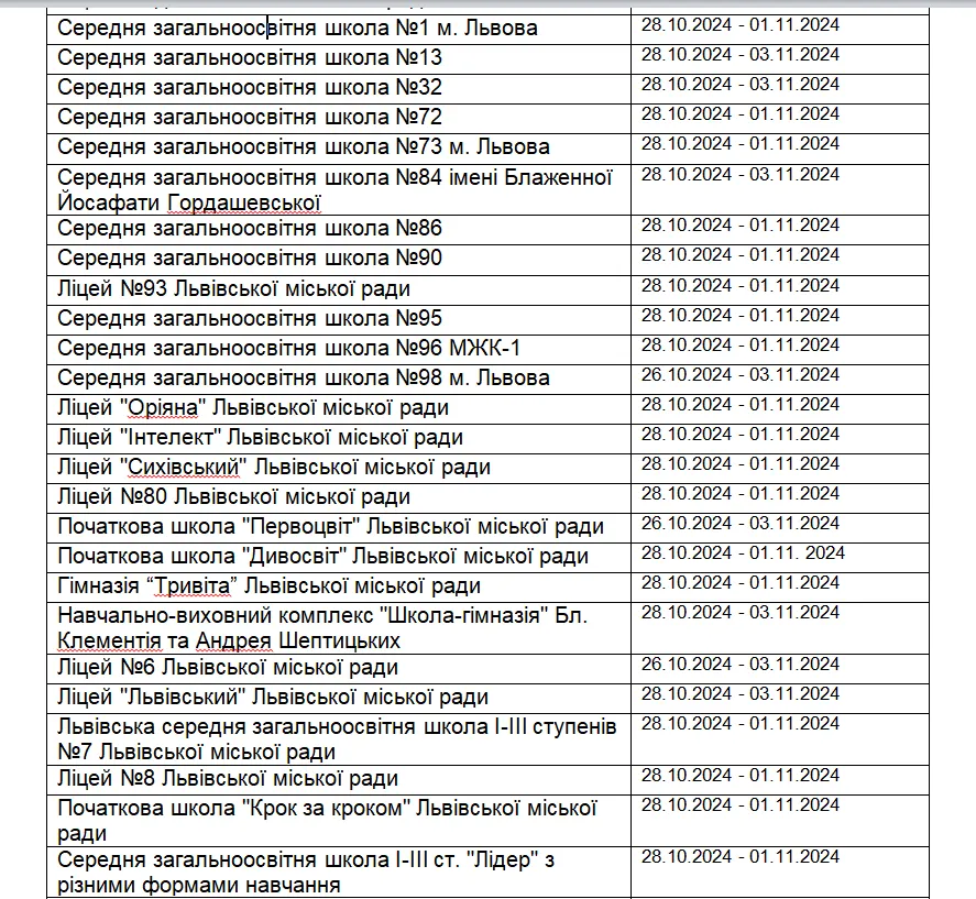 Детальні графіки осінніх канікул у школах Львова у 2024 році