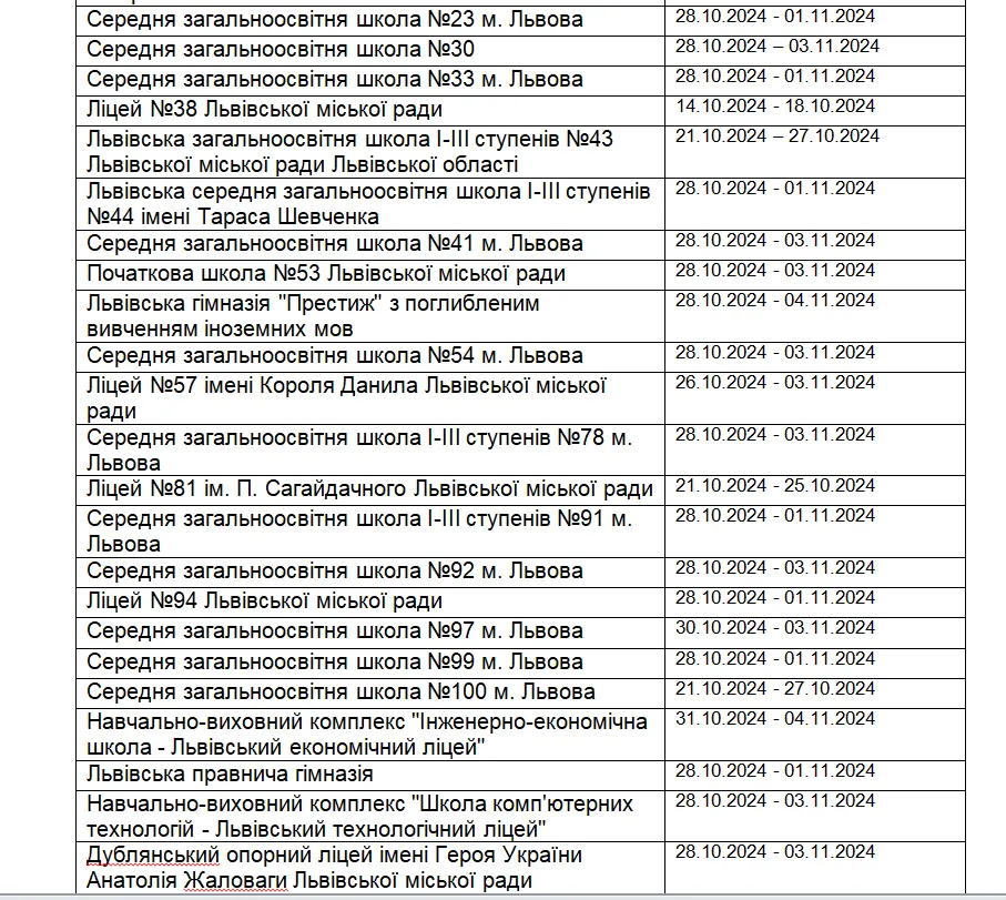 Графіки осінніх канікул у школах Львова у 2024 році / Львівська міська рада