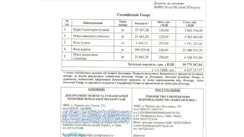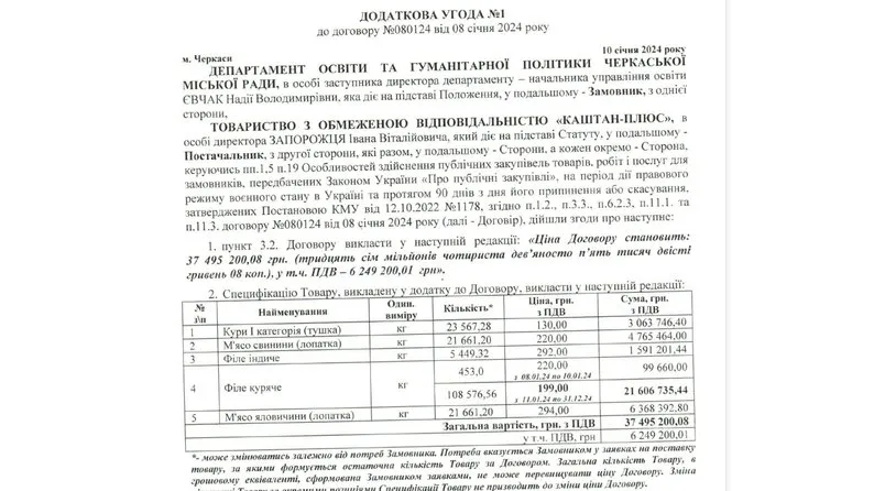 23 грудня департамент освіти та гуманітарної політики Черкаської міськради оголосив торги на закупівлю майже 200 тонн різного м'яса для дитсадків. Пропозицію подало одне підприємство – товариство "Каштан-плюс". За результатом підписаної угоди вартість кілограма курячого філе становила 220 гривень. Згодом ціну знизили до 199 гривень.
