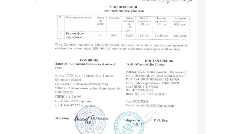 І додав, що на Житомирщині відділ освіти купив філе по 158 гривень за кілограм, на Вінниччині – по 144 гривень за кілограм. Це підтверджують документи на "Прозорро".