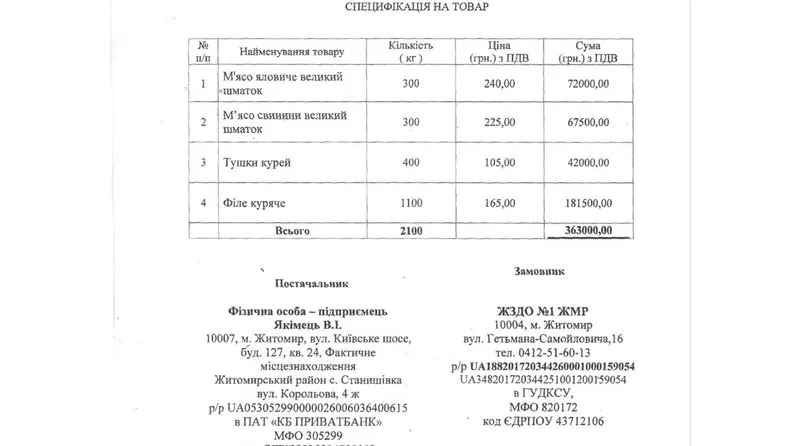 Договір на закупівлю м'яса у Житомирській області / скриншот із сайту "Прозорро"