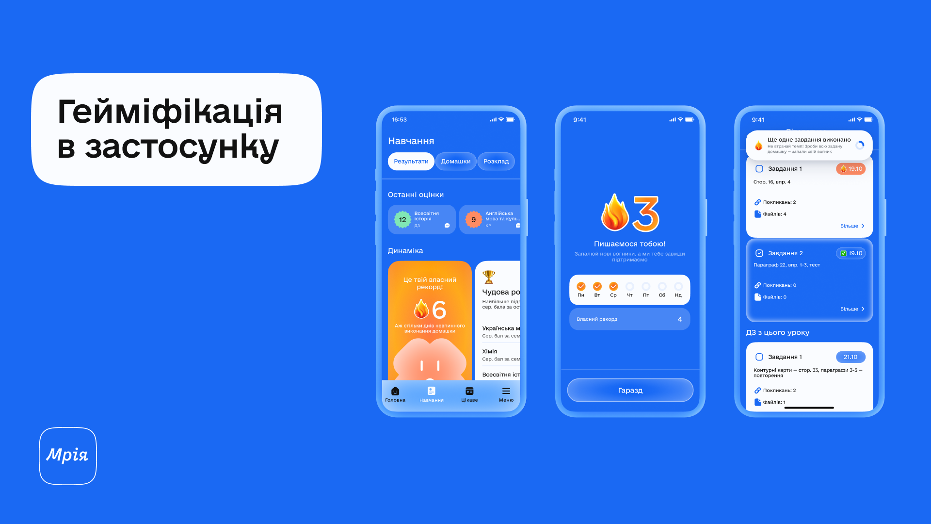 У застосунку Мрія діти отримуватимуть вогники за кожне виконане завдання й підтримуватимуть ланцюжок активності – як у Duolingo. Ми вивчили найкращі практики й адаптували цю механіку до шкільного навчання. Вона допоможе формувати корисні звички, системність і регулярність. Тепер дітей затягуватимуть не ігри, а навчання і розвиток. Це не просто гейміфікація – це нова культура мотивації до знань,